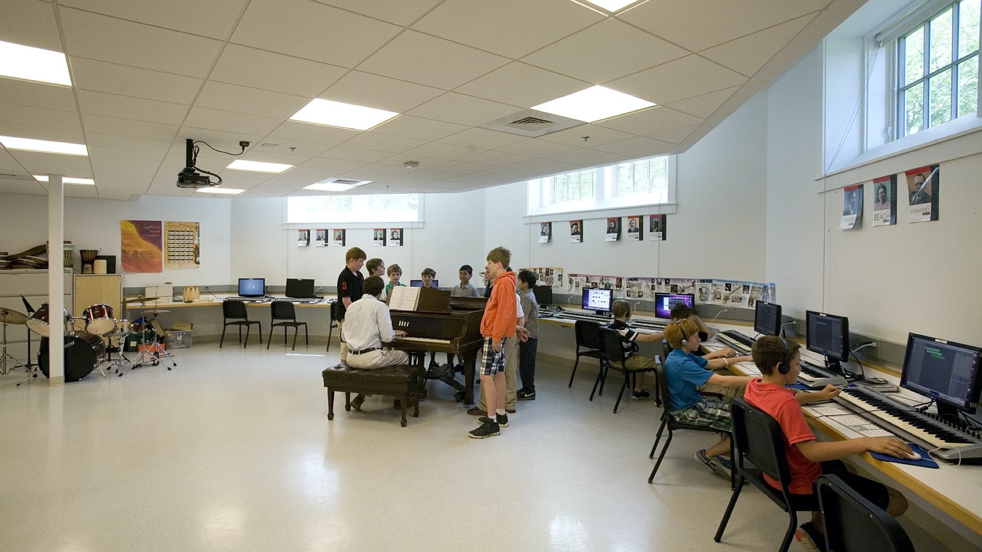 Situated in the center of the campus, The Fenn School’s new 16,000sf Meeting and Performance Hall features a 458-seat theater, classroom space, multi-purpose areas, and a large meeting room. The steel-frame/wood-infill building, with its functional basement, was built over a high water table, which required an elaborate dewatering system during foundation construction and a permanent underground pump to monitor water in the functional basement on an ongoing basis. The seating in the theater is made of steamed European beech wood; beech panels also outline the walls and balcony. Project architect, Imai Keller Moore, and AKF Engineers designed the MEP systems for minimal noise intrusion. This new hall can accommodate the entire student body at one time for programs, performances, and assemblies.