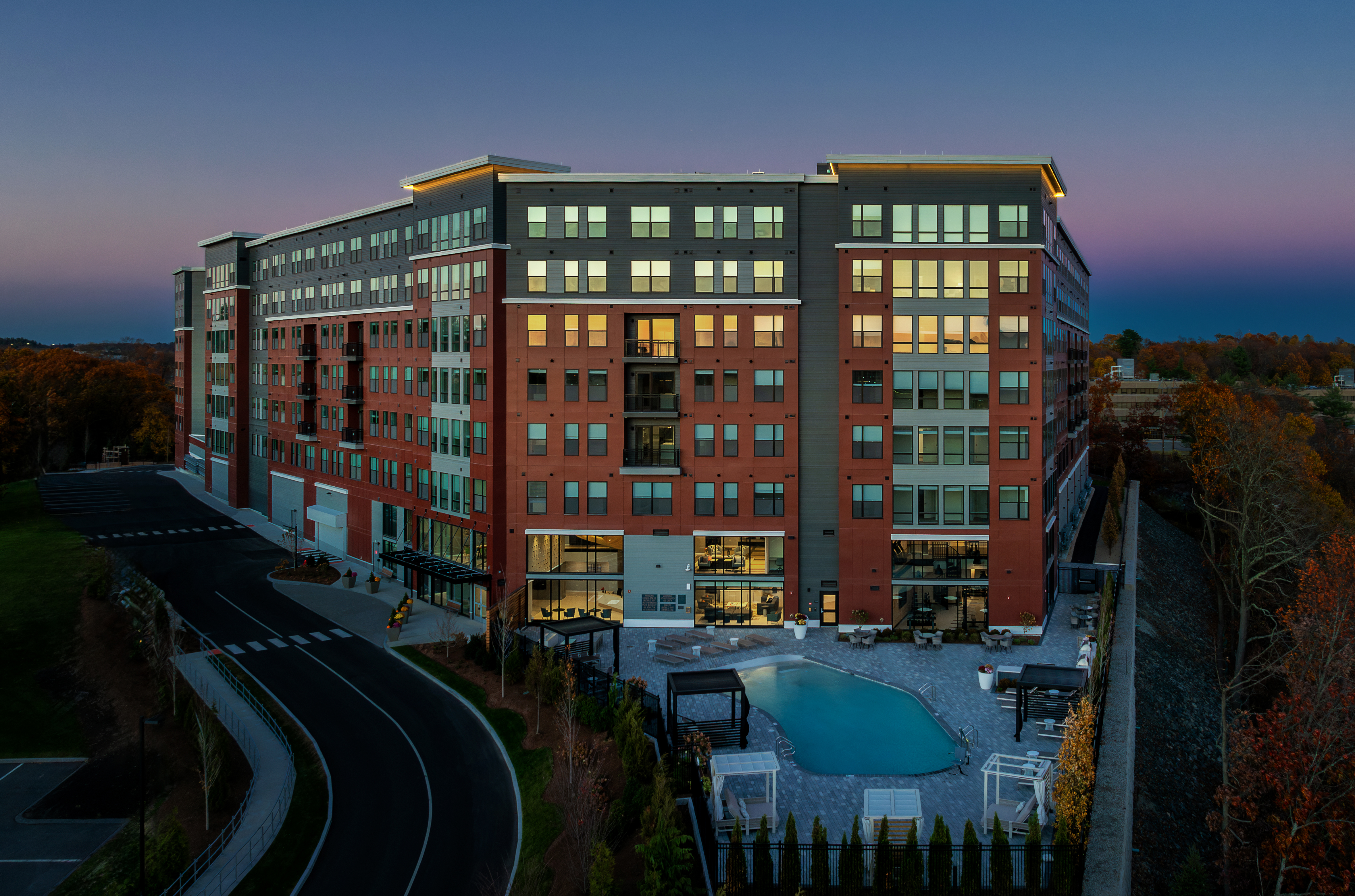 Alliance Residential selected Erland, in collaboration with CUBE 3, to construct a new 314-unit apartment building in Waltham. The 552,704sf residence houses 1-, 2- and 3-bedroom units. Perched above the tree line along Winter Street, The 305 offers views of the nearby Cambridge Reservoir as well as Boston’s skyline. The triangular-shaped building features a large interior courtyard, resort-style pool deck, two-story fitness facility, speakeasy lounge, dog park and extensive work from home facilities. It consists of five and a half stories of wood frame over a two and a half story post tension garage. The 305 has surface spaces and parking under the building for 472 cars as well as a wide array of amenities that offer a balanced, modern lifestyle. Erland completed The 305’s sister property – The Val – in the fall of 2021.
