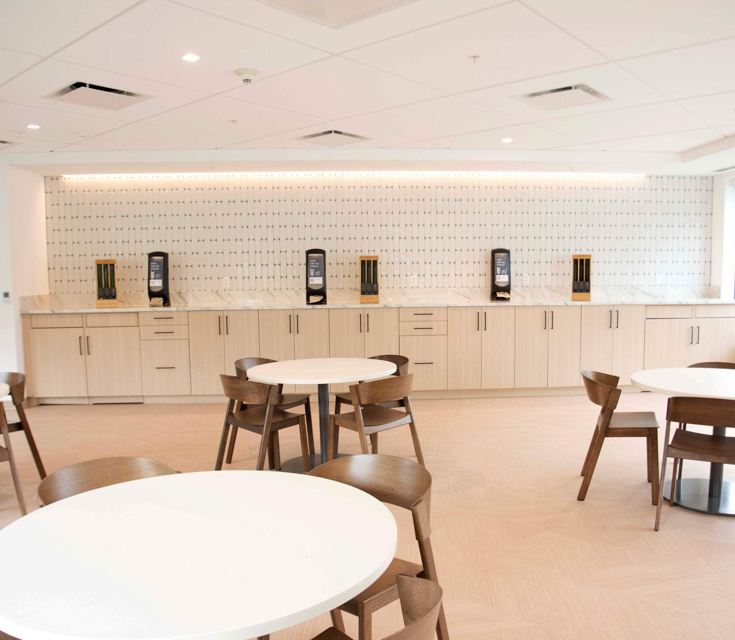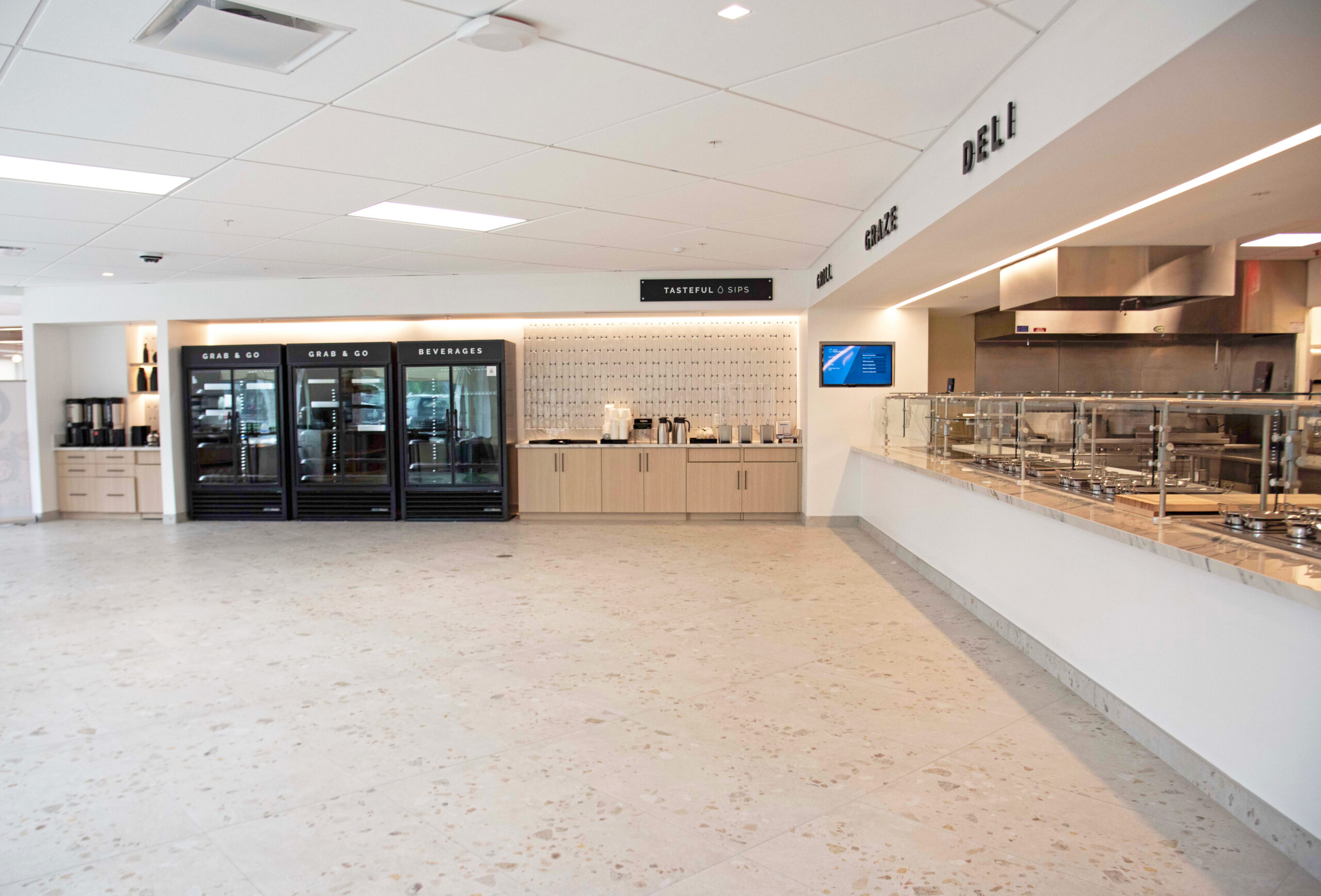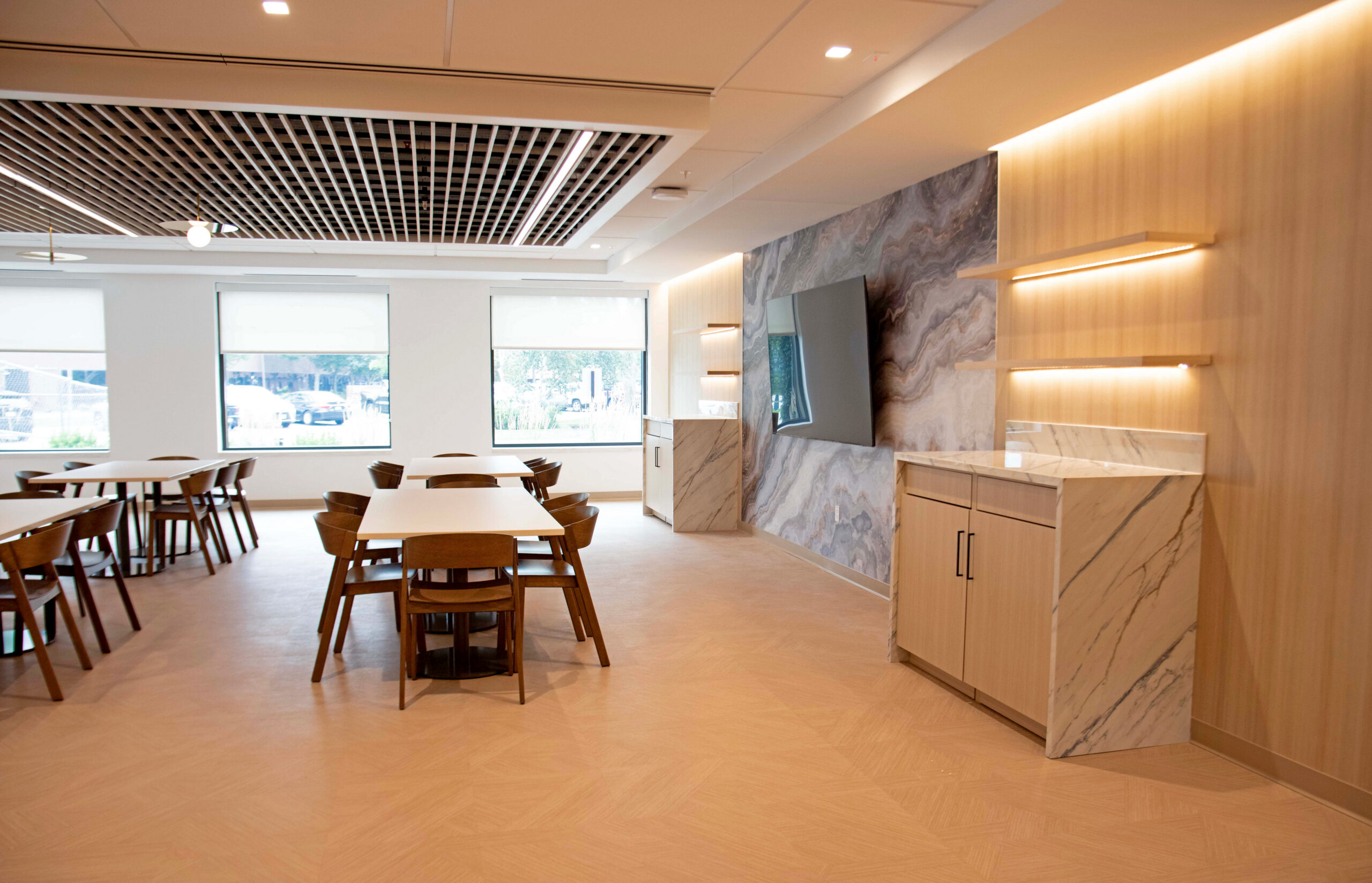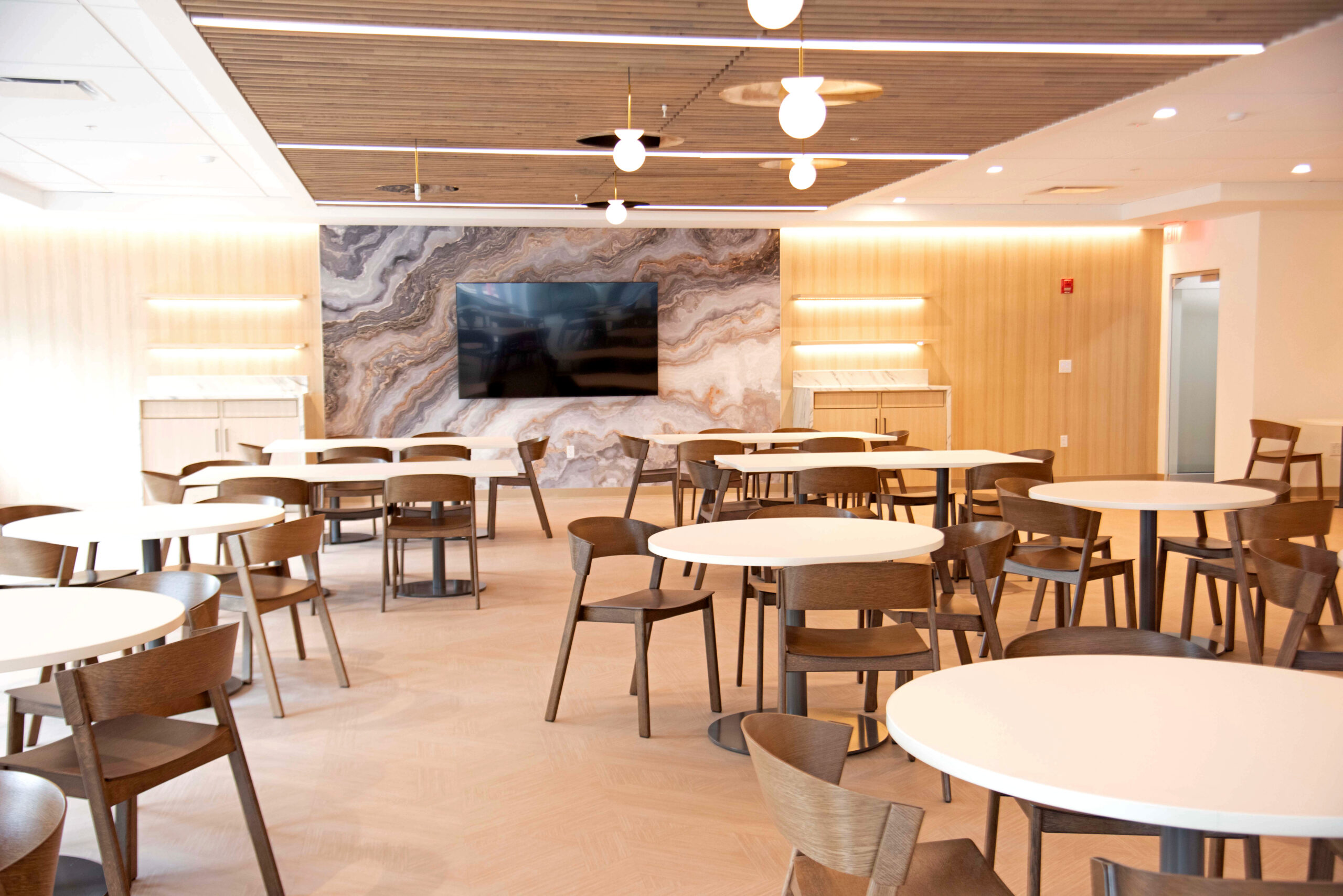 Hobbs Brook Real Estate (HBRE), a leading innovator in commercial real estate with a portfolio of sustainable properties across the United States and Singapore, selected Erland Construction to renovate the cafe at 601 Edgewater Drive, a 5-story, 155,000sf office building within their bustling The Edge campus in Wakefield. Partnering with Margulies Perruzzi Architects, Erland transformed the cafe and dining area into a modern, inviting amenity space for tenants. The renovation featured upgraded finishes, millwork, lighting, acoustical ceiling tiles, and sprinkler heads, along with substantial modifications to the building’s existing mechanical, electrical, and plumbing (MEP) systems. A new outdoor patio was also added adjacent to the cafe to provide additional seating and a flexible gathering space. Throughout the project, Erland worked closely with HBRE to ensure building operations continued seamlessly, prioritizing safety. The project met all FM standards, reflecting Erland’s commitment to safety and quality.