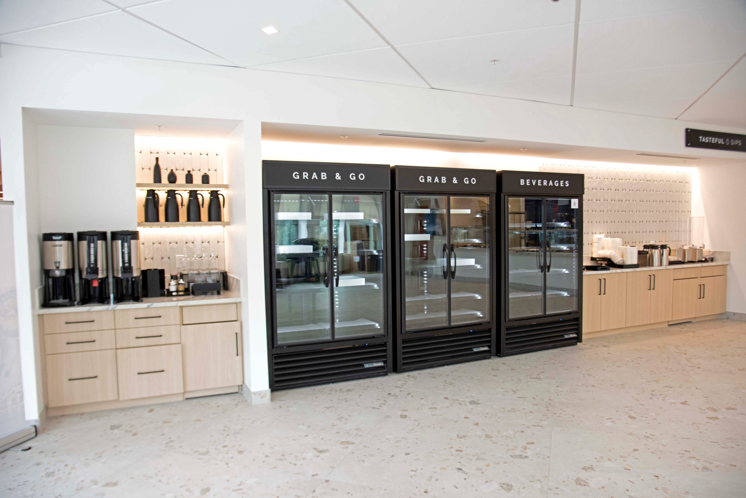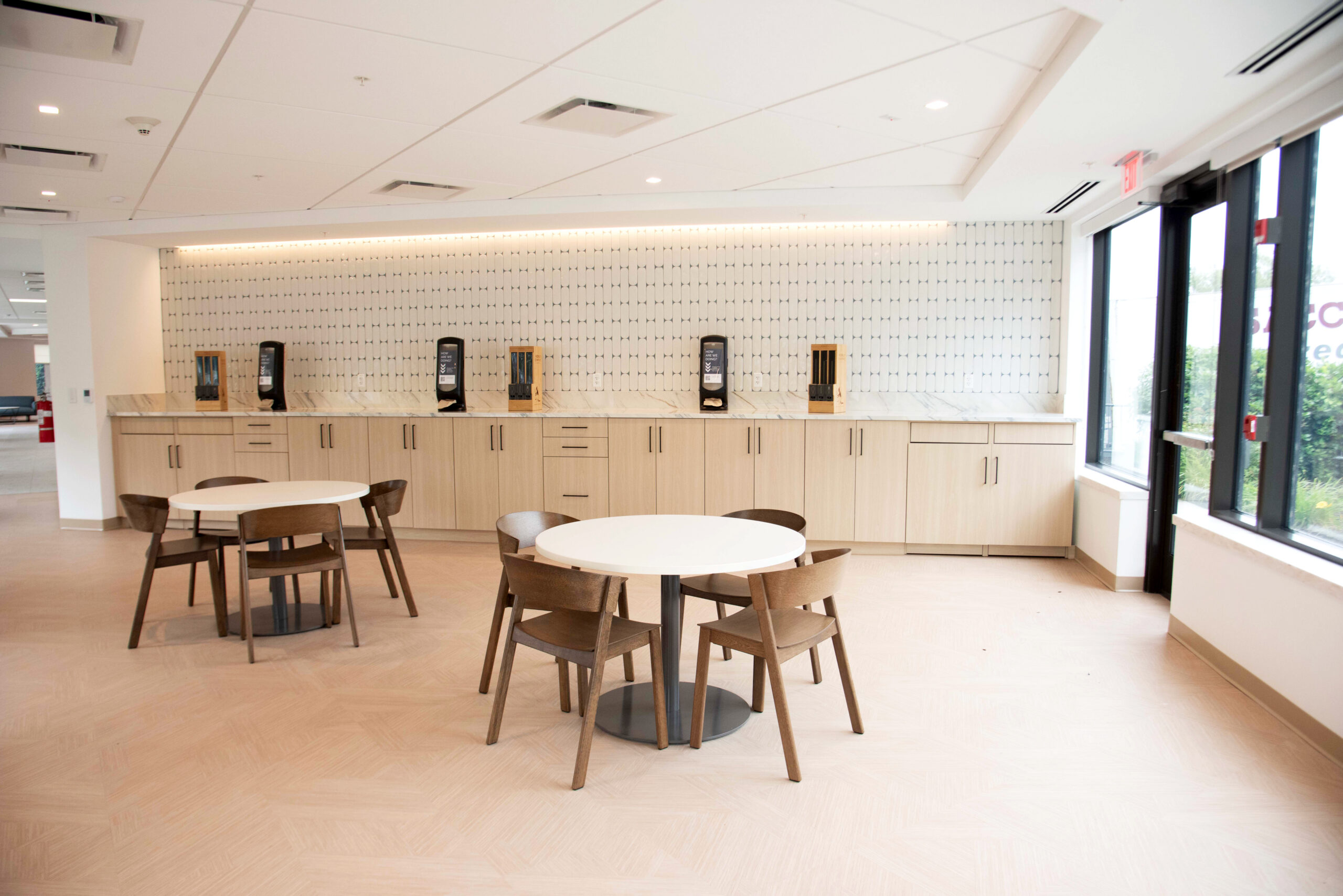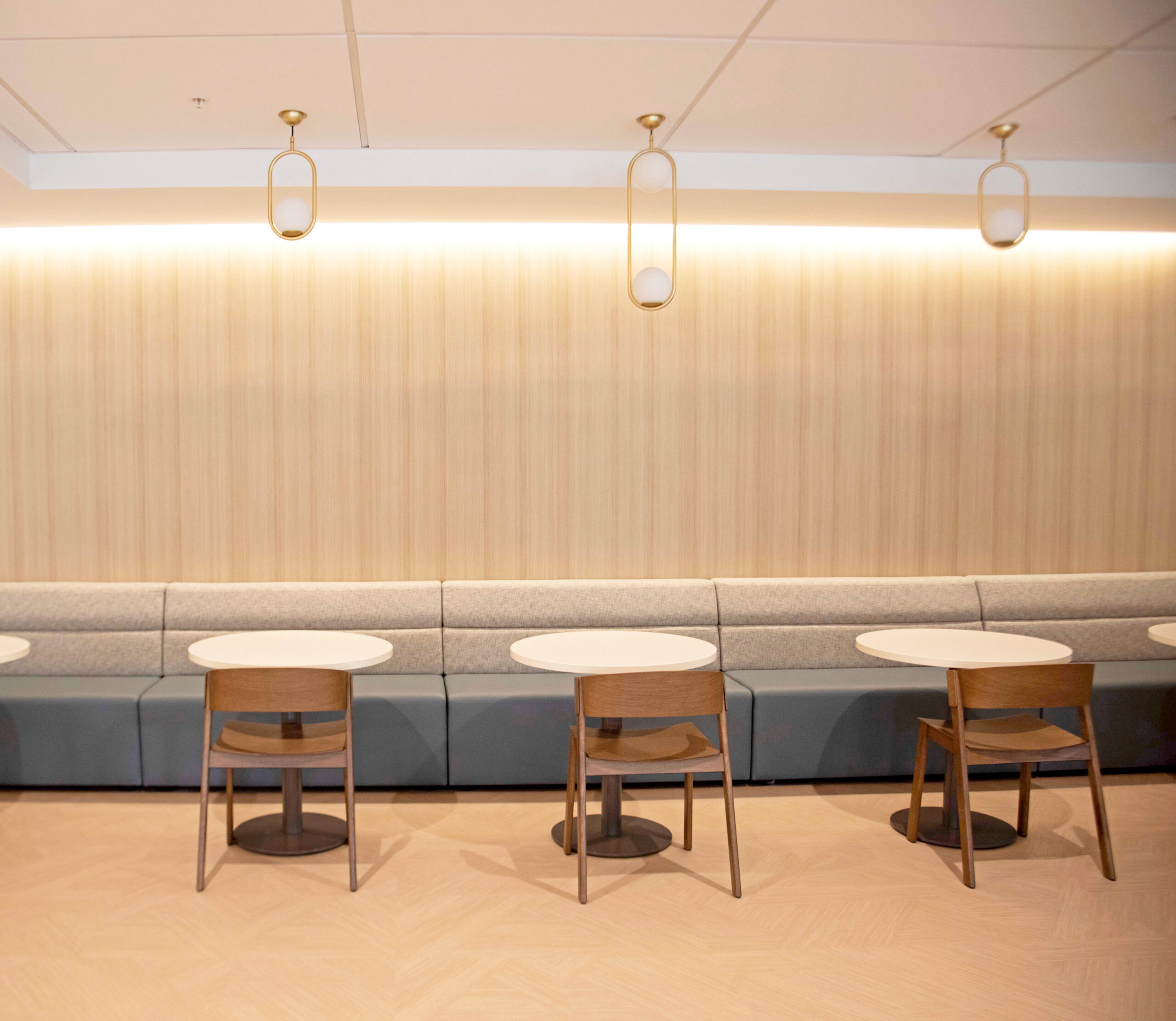 Hobbs Brook Real Estate (HBRE), a leading innovator in commercial real estate with a portfolio of sustainable properties across the United States and Singapore, selected Erland Construction to renovate the cafe at 601 Edgewater Drive, a 5-story, 155,000sf office building within their bustling The Edge campus in Wakefield. Partnering with Margulies Perruzzi Architects, Erland transformed the cafe and dining area into a modern, inviting amenity space for tenants. The renovation featured upgraded finishes, millwork, lighting, acoustical ceiling tiles, and sprinkler heads, along with substantial modifications to the building’s existing mechanical, electrical, and plumbing (MEP) systems. A new outdoor patio was also added adjacent to the cafe to provide additional seating and a flexible gathering space. Throughout the project, Erland worked closely with HBRE to ensure building operations continued seamlessly, prioritizing safety. The project met all FM standards, reflecting Erland’s commitment to safety and quality.