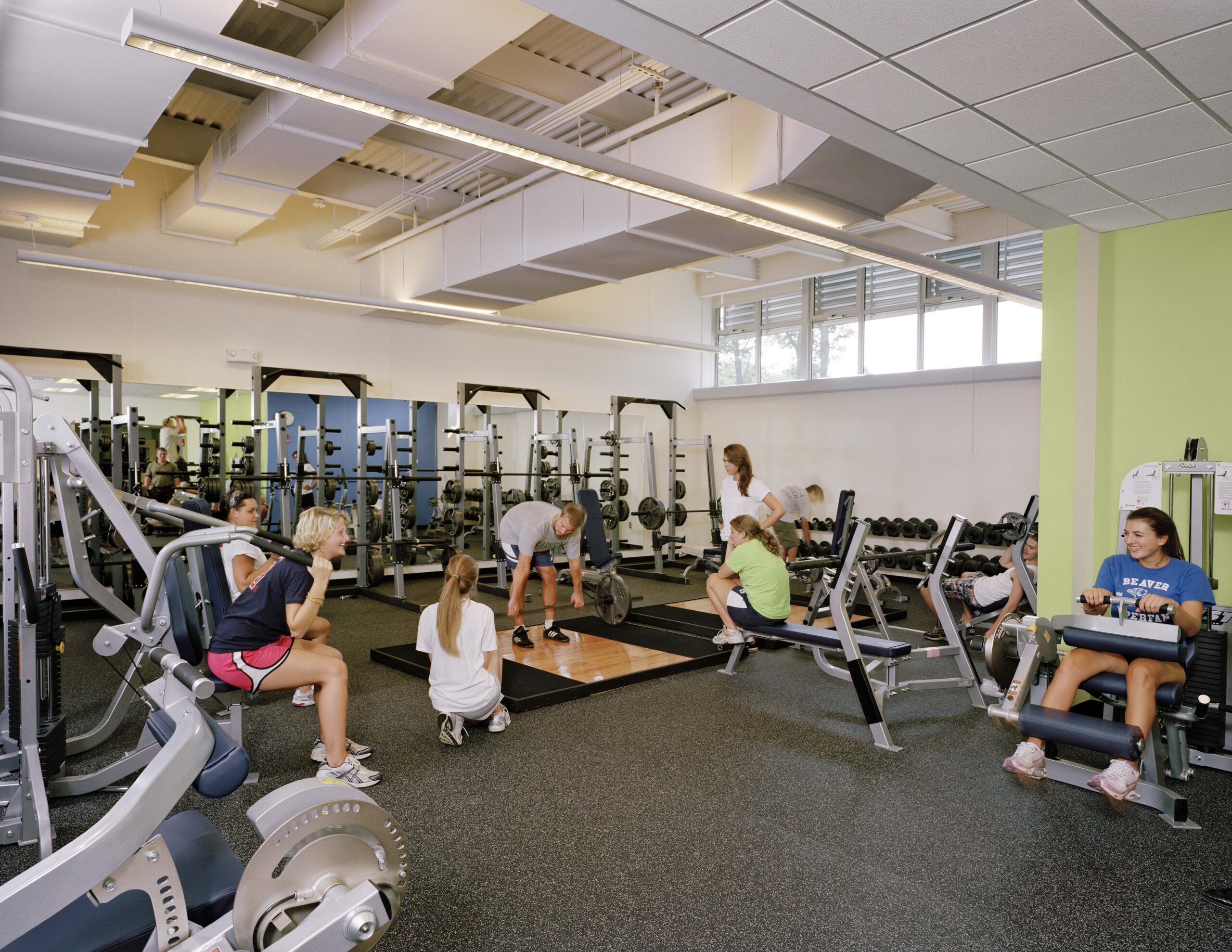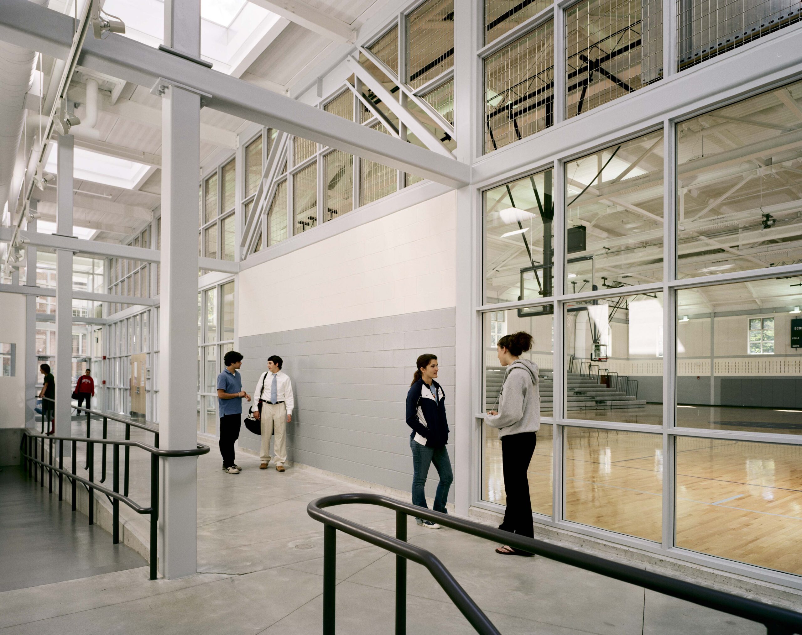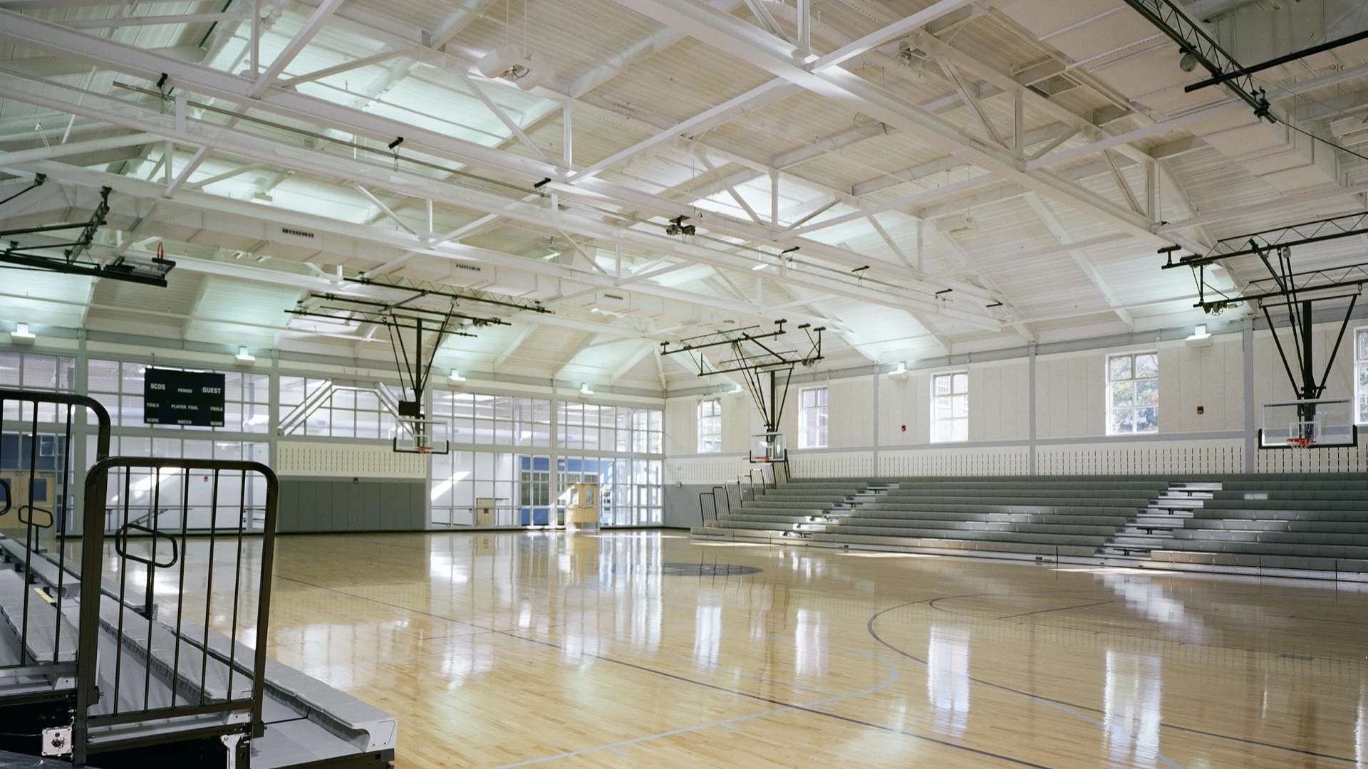 The new Athletic Center expanded and improved on athletic facilities on the BCDS Campus. The new building is adjacent to the existing gym, which remained in use throughout construction. An Access Road Safety Plan was developed to provide for safe crossing and deliveries. The new Center houses two indoor courts for basketball and volleyball with a full size overlapping basketball court, as well as improved and centralized locker and shower facilities for team and everyday use. The building also includes a multipurpose fitness room, which can be used for wrestling or dance. Patrons enter the new Athletic Center from a renovated exterior plaza, which also provides access to the older gym. The glazed entrance and lobby area houses a gallery space that overlooks the new main gym. This Athletic Center was the second project that Erland and HMFH were selected to design and construct for BCDS.