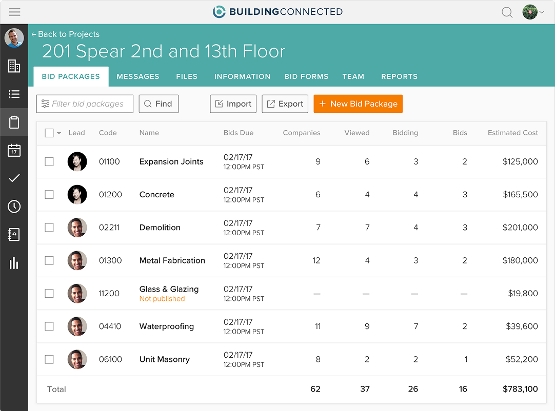Firms provide details about their company background, financials, and safety records through BuildingConnected, our bid management platform.